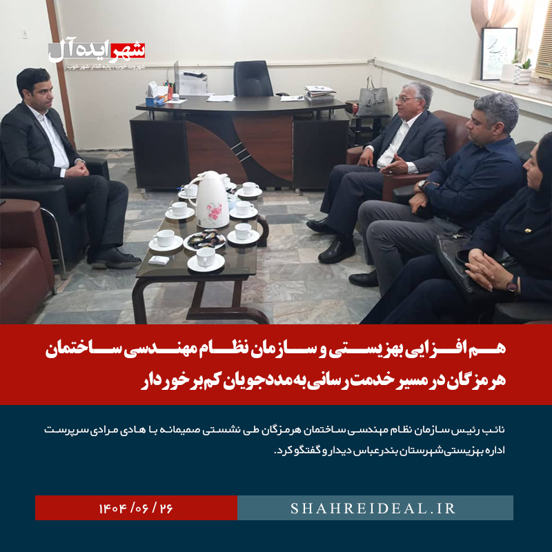 به گزارش شهر ایده آل، دکتر عامری نائب رئیس سازمان نظام مهندسی ساختمان هرمزگان به اتفاق هیات همراه ضمن حضور در اداره بهزیستی شهرستان بندرعباس طی نشستی صمیمانه با هادی مرادی سرپرست بهزیستی شهرستان بندرعباس از نزدیک دیدار و گفتگو کرد .
