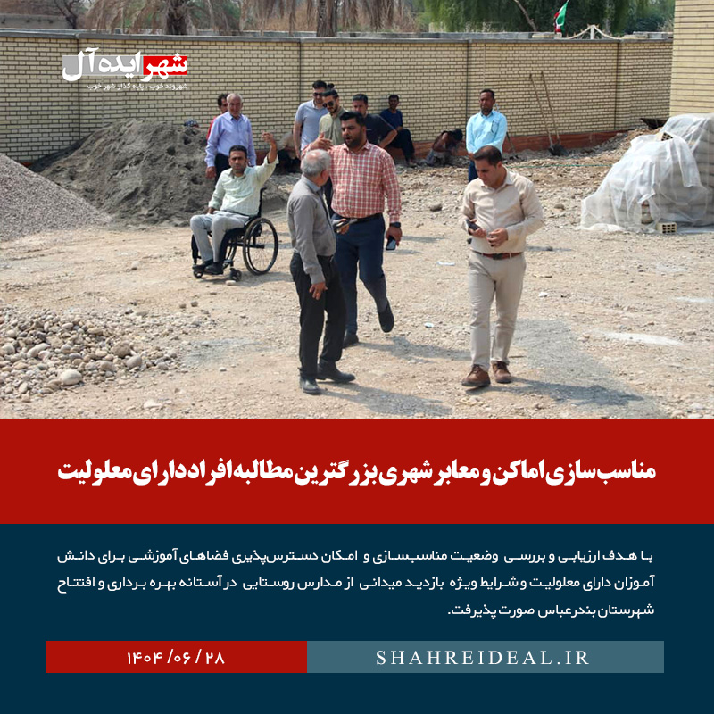 به گزارش شهر ایده آل، با هدف ارزیابی و بررسی وضعیت فنی مناسبسازی و نیز سهولت در دسترسپذیری فضاهای آموزشی برای دانشآموزان دارای معلولیت وبا شرایط خاص ، اعضای کمیته فنی مناسبسازی این شهرستان متشکل از ناظر مناسب سازی بهزیستی ، ناظر مناسب سازی نوسازی مدارس ، پیمانکار پروژه در دست بهره برداری و نماینده افراد دارای معلولیت در اقدامی فنی و نظارتی، بازدید میدانی دقیقی از مدرسه برکت در آستانه افتتاح و بهرهبرداری در روستای دهنو شهر بندرعباس آغاز کردند.